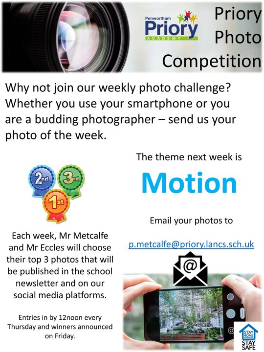 To enter: Email your photos from your school email address to Mr Metcalfe at p.metcalfe@priory.lancs.sch.uk. Entry closes each week at 12 noon on Thursday with the winner announced on Friday.